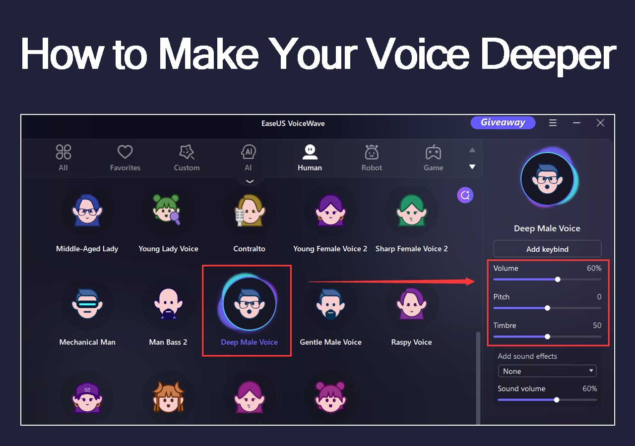 Trocador de voz AI avançado EaseUS VoiceWave oferece uma variedade de efeitos sonoros. Se você usar este trocador de voz para PC, poderá mergulhar em ligações com seus amigos. Você pode alterar o tom, o timbre, o volume, o tom da sua voz e outros aspectos se precisar de mais personalização.