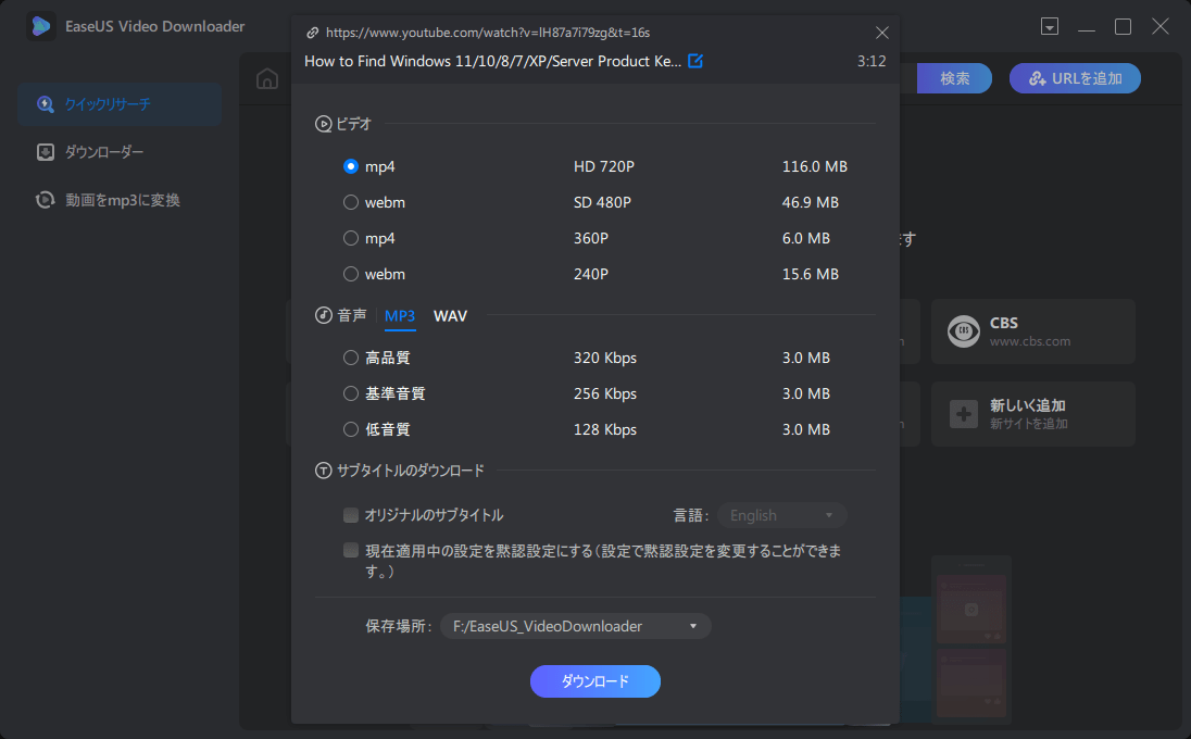 EaseUS Video Downloader は、オンラインビデオからオーディオを抜け出すことができます。まずはビデオをダウンロードして、そしてビデオからオーディオファルを抜け出して、 MP3ファイルに変換します。さらに、320kbps、256kbps、128kbpsなどのオーディオ品質が提供されます。