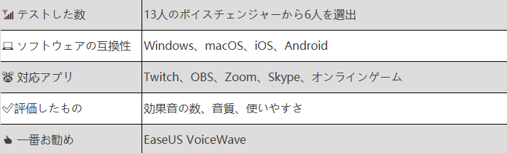 この記事の次のセクションでは、Windows/Mac用の9つの無料のAIソングスピーチコンバータを推奨し、テストし、異なるデバイス上でこれらのツールのすべてをテストします。詳しくは以下の表をご覧ください。