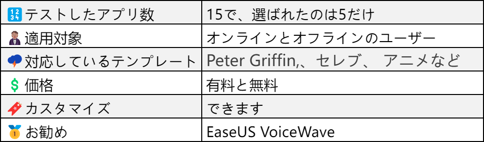 取り上げたツールの中で、EaseUS VoiceWaveを強くお勧めします。リアルタイムAI対応の音声変更、100種類以上の音声効果のサポート、様々な音声オプション、音声をMP3として録音、変更、共有する機能など、独自の機能を備えているからです。最高の音声変更体験をするには、今すぐEaseUS VoiceWaveをコンピューターにダウンロードしてインストールしてください。