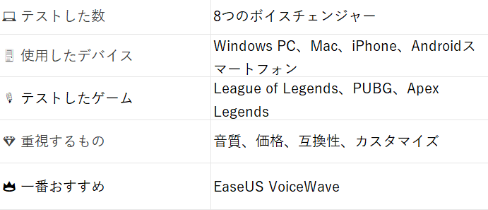 | 🔢テストしたボイスチェンジャーの数 | 20つ(選ばれたのは7つだけ) |