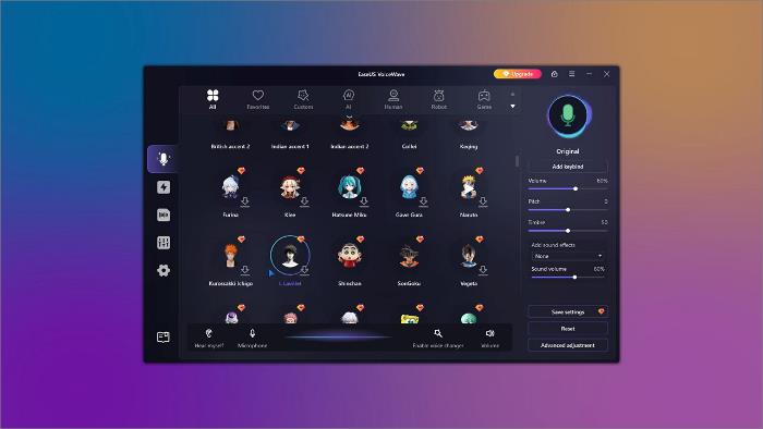 EaseUS VoiceWave is one of the best anime voice changers for PC. Utilizing AI-powered technology, this tool allows users to achieve an anime voice without any voice distortion while preserving the clarity of their own voice. Powered by advanced AI technology, this tool delivers high-quality anime voice effects without distortion, all while maintaining the natural clarity of your original voice. Whether you want to mimic characters from One Piece, Demon Slayer, My Hero Academia, SPY x FAMILY (Anya Forger), or other popular anime, it helps bring those voices to life in real time. It's fully compatible with platforms like Discord, VRChat, and TeamSpeak, making it ideal for gaming, streaming, and online chat.