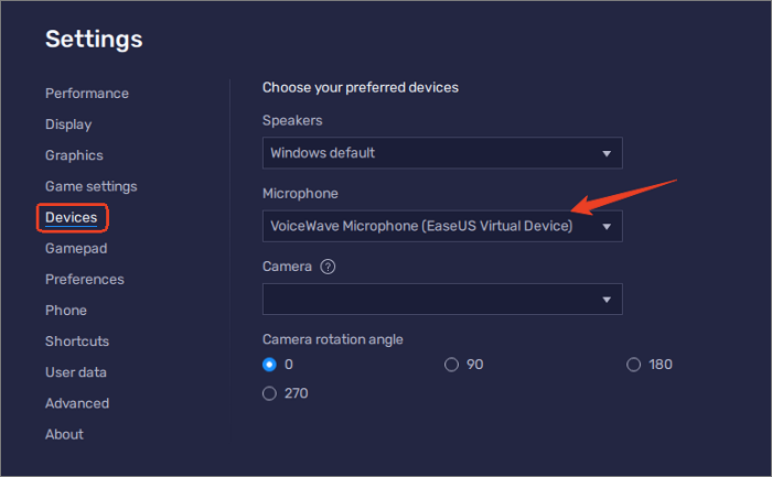 Step 4. Inside BlueStacks, go to "Settings" > "Devices" > "Choose your preferred audio devices" > Select "VoiceWave Microphone" as Microphone and press "Save Changes."